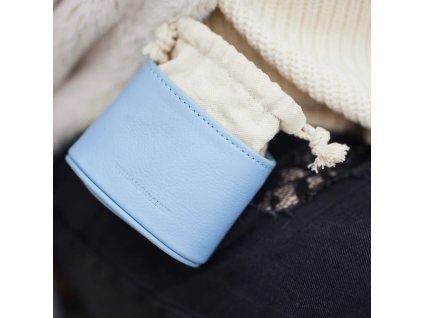 Vysoce kvalitní taška na pamlsky ze světle modré kůže s praktickými možnostmi uchycení pro stylový výcvik psů.