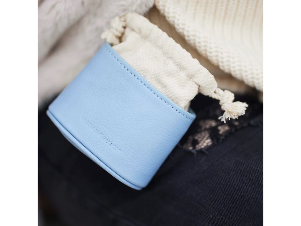 Vysoce kvalitní taška na pamlsky ze světle modré kůže s praktickými možnostmi uchycení pro stylový výcvik psů.