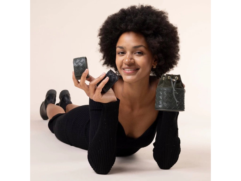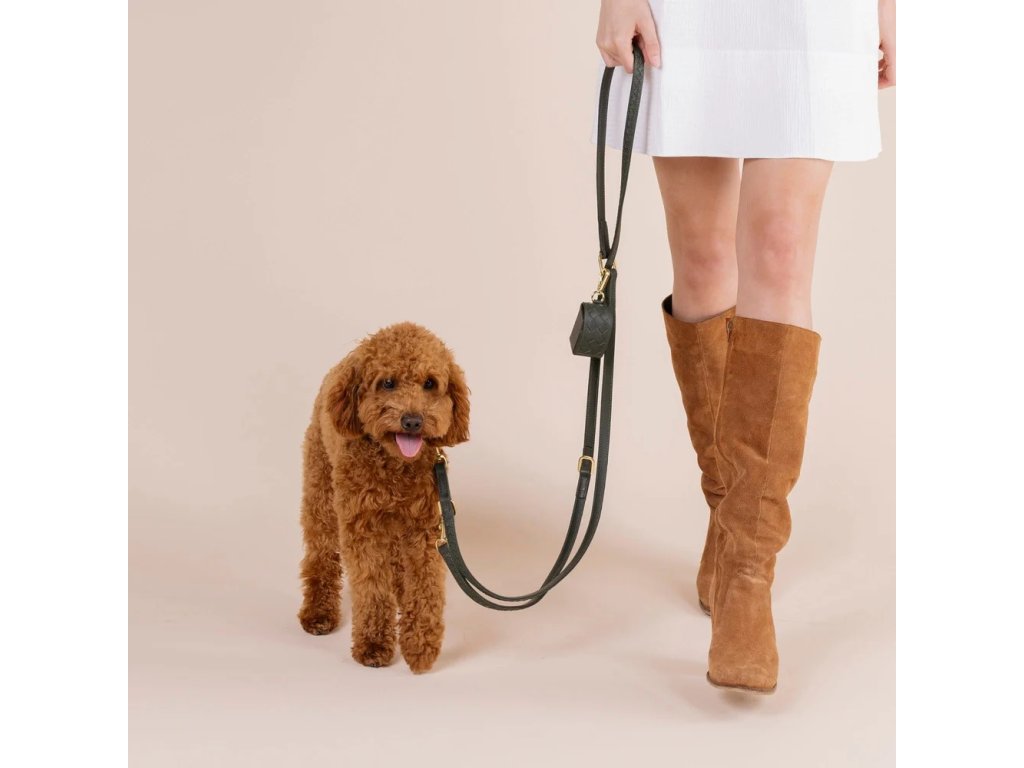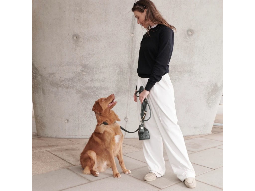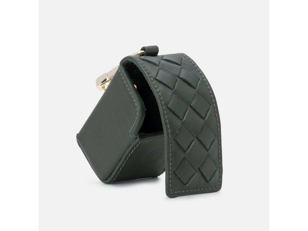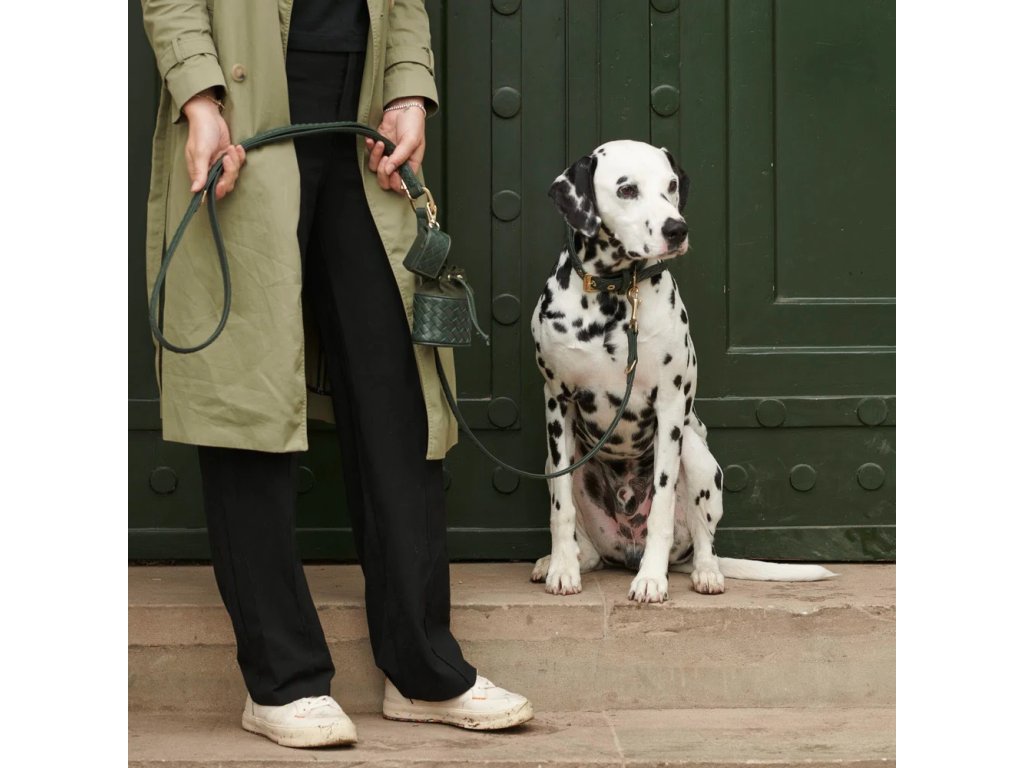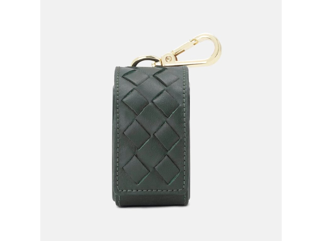 Ručně vyrobený dávkovač sáčků na exkrementy z tmavě zelené, měkké kůže nappa s elegantním pleteným vzorem a praktickým otvorem na zadní straně pro vytahování sáčků.