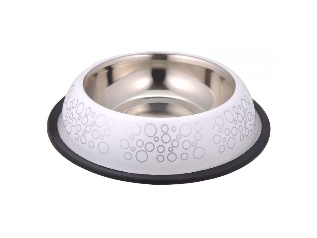 Pohodlná a praktická kovová miska na krmivo a vodu s gumou a moderní grafickou dekorací - série bubliny. Vhodná pro kočky i malá plemena psů. Vyrobena z kombinace vysoce kvalitní nerezové oceli a gumy s krásným stylizovaným vzorem s kulatými tvary. Gumová základna zabraňuje klouzání misky a poškrábání podlahy.