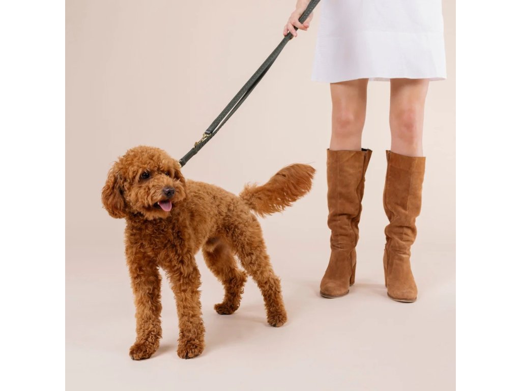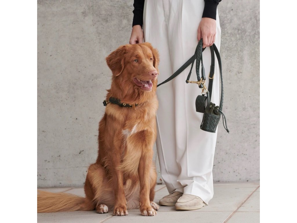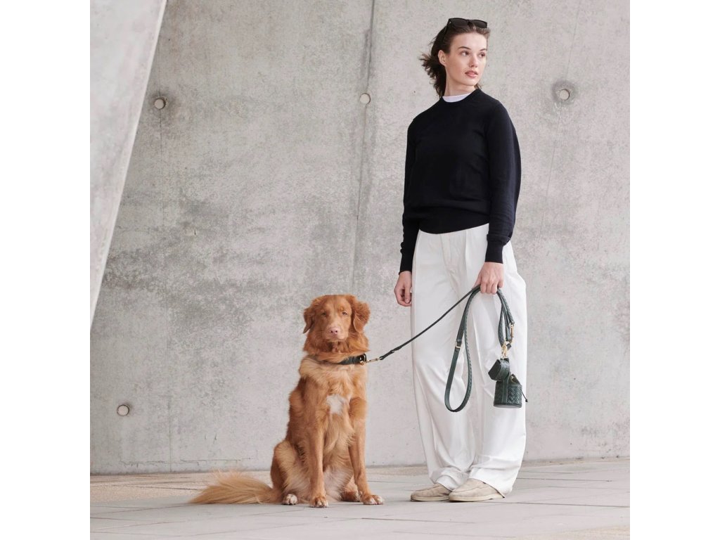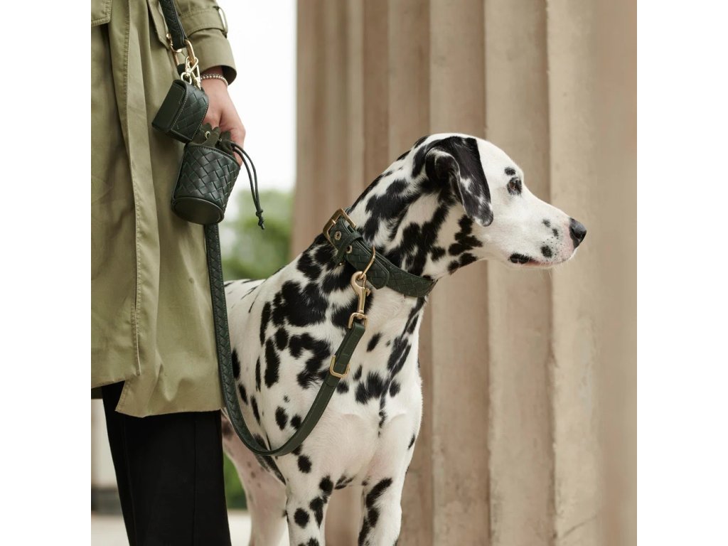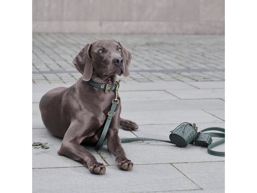 Ručně pletené vodítko pro psy z tmavě zelené kůže nappa se zlatými mosaznými kováními. K dispozici ve dvou velikostech pro malé a velké psy.