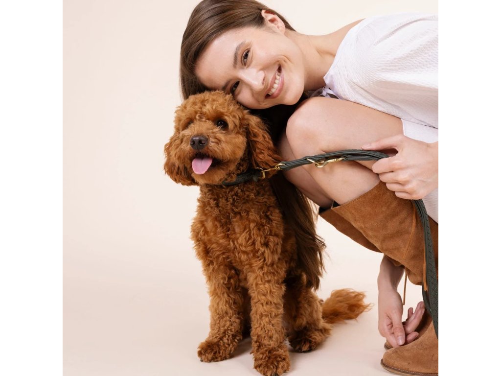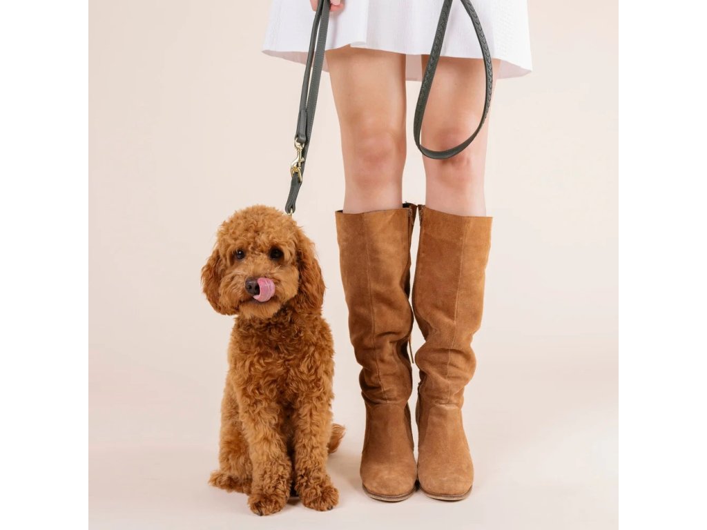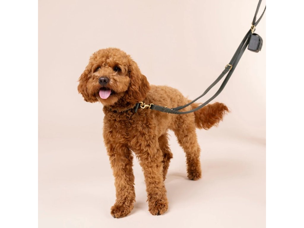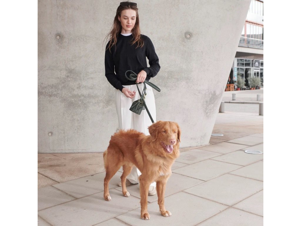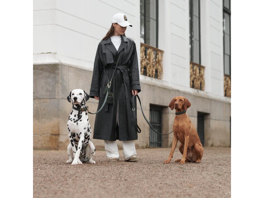 Ručně pletené vodítko pro psy z tmavě zelené kůže nappa se zlatými mosaznými kováními. K dispozici ve dvou velikostech pro malé a velké psy.